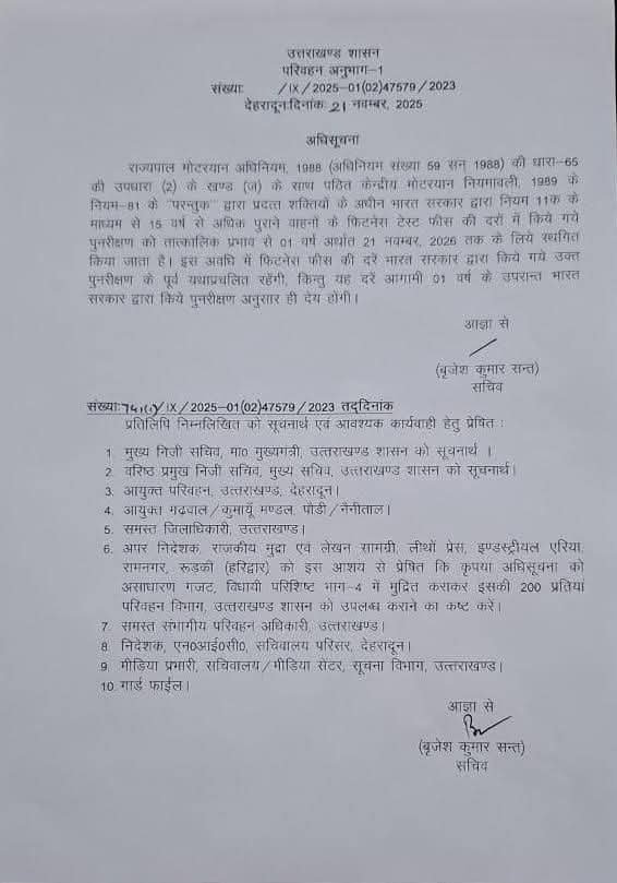 मुख्यमंत्री पुष्कर सिंह धामी के निर्देश पर राज्य सरकार ने उत्तराखंड के वाहन स्वामियों को महत्वपूर्ण राहत प्रदान करते हुए पुराने (15 वर्ष) कमर्शियल वाहनों की फिटनेस फीस में वृद्धि को आगामी 21 नवम्बर 2026 तक स्थगित कर दिया है। इस संबंध में परिवहन विभाग द्वारा अधिसूचना जारी कर दी गई है। अधिसूचना सचिव परिवहन श्री बृजेश कुमार संत द्वारा जारी की गई।