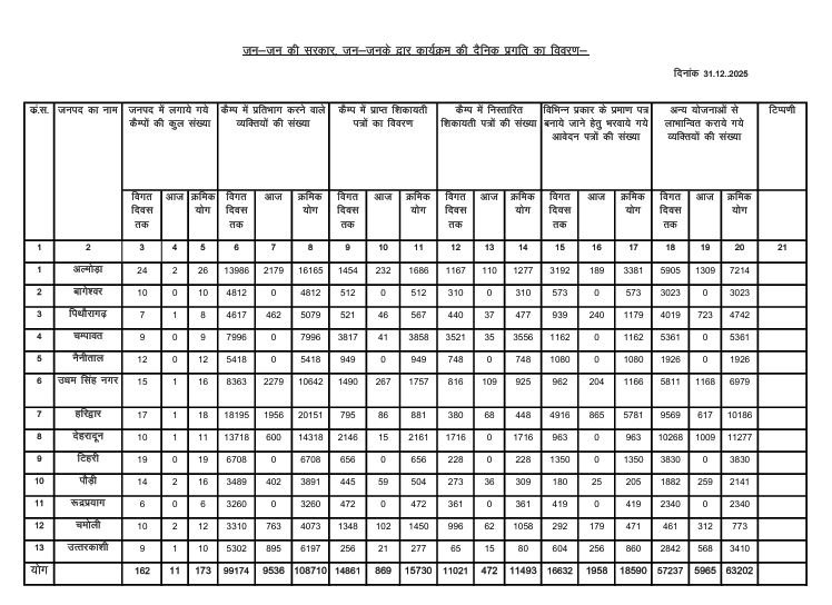 मुख्यमंत्री पुष्कर सिंह धामी ने कहा कि “जन-जन की सरकार, जन-जन के द्वार” कार्यक्रम प्रदेश में सुशासन, संवेदनशीलता और समाधान का सशक्त माध्यम बन चुका है। सरकार का संकल्प है कि कोई भी नागरिक योजनाओं और सेवाओं से वंचित न रहे। आज 31 दिसंबर 2025 तक प्रदेश के 13 जनपदों में 173 शिविरों का आयोजन किया गया, जिनमें 1,08,710 से अधिक आवेदन प्राप्त हुए। इनमें से 15,730 आवेदनों का त्वरित निस्तारण किया गया तथा 11,493 से अधिक नागरिकों को प्रमाण-पत्र एवं सेवाएं मौके पर उपलब्ध कराई गईं। इस अभियान के माध्यम से 63,202 से अधिक लोग विभिन्न सरकारी योजनाओं से लाभान्वित हुए हैं।