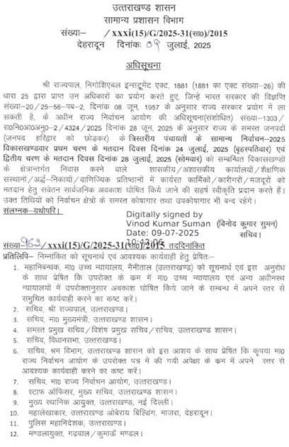 श्री राज्यपाल, निगोशिएबल इन्सट्रूमेंट एक्ट 1881 (1881 का एक्ट संख्या-26) की धारा 25 द्वारा प्राप्त उन अधिकारों का प्रयोग करते हुए, जिन्हें भारत सरकार की विज्ञप्ति संख्या-20/25-56-पब-2, दिनांक 08 जून, 1957 के अनुसार राज्य सरकार प्रयोग में ला सकती है, के अधीन राज्य निर्वाचन आयोग की अधिसूचना (संशोधित) संख्या-1303/रा०नि०आ०अनु०-2/4324/2025 दिनांक 28 जून, 2025 के अनुसार राज्य के समस्त जनपदों (जनपद हरिद्वार को छोड़कर) के त्रिस्तरीय पंचायतों के सामान्य निर्वाचन-2025 विकासखण्डवार प्रथम चरण के मतदान दिवस दिनांक 24 जुलाई, 2025 (बृहस्पतिवार) एवं द्वितीय चरण के मतदान दिवस दिनांक 28 जुलाई, 2025 (सोमवार) को सम्बन्धित विकासखण्डों के क्षेत्रान्तर्गत निवास करने वाले शासकीय/अशासकीय कार्यालयों/शैक्षणिक सस्थाना/अर्द्ध-निकायों/वाणिज्यिक प्रतिष्ठानों में कार्यरत कार्मिकों/कारीगरो/मजदूरों को मतदान हेतु सवेतन सार्वजनिक अवकाश घोषित किये जाने की सहर्ष स्वीकृति प्रदान करते हैं। उक्त तिथियों को निर्वाचन क्षेत्रों के समस्त कोषागार तथा उपकोषागार भी बन्द रहेंगे।